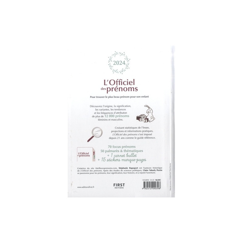 Croisant statistiques de l'Insee et informations pratiques, L'Officiel des prénoms s'est imposé depuis 20 ans comme le guide référence. Inclus : - 70 focus prénoms - 50 palmarès & thématiques - une centaine de prénoms enrichis par des anecdotes et références + 1 carnet bullet au début de l'ouvrage pour aider les parents à lister leurs idées : short-list des prénoms favoris de papa et de maman, arbre généalogique, petits jeux...