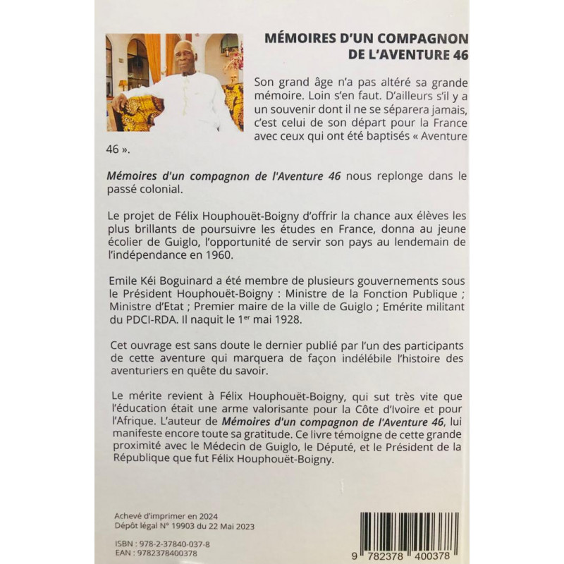 Le mérite revient à Félix Houphouët-Boigny, qui sut très vite que 'éducation était une arme valorisante pour la Côte d'Ivoire et pour l'Afrique. L'auteur de Mémoires d'un compagnon de l'Aventure 46, lui manifeste encore toute sa gratitude. Ce livre témoigne de cette grande proximité avec le Médecin de Guiglo, le Député, et le Président de la République que fut Félix Houphouët-Boigny.