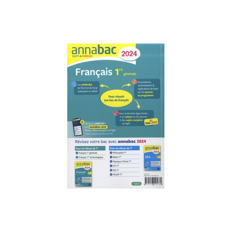 - Puis deux types de corrigés : - " guidés " , pour comprendre comment faire une bonne copie - " flash " , pour réviser efficacement dans la dernière ligne droite En complément : un mémo sur les oeuvres au programme En plus, avec l'achat de l'ouvrage, un abonnement gratuit au site de révision http : //www. annabac. com (Lien -> http : //www. annabac. com/) : fiches et vidéos de cours, quiz, sujets corrigés...