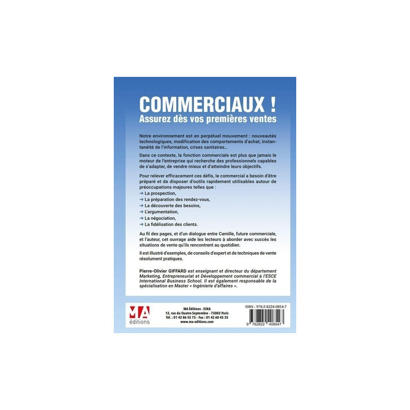 PUBLIC : A qui s'adresse ce livre ? Au fils des pages, et d'un dialogue entre Camille, future commercial, et l'auteur, cet ouvrage aide les lecteurs à aborder avec succès les situations de vente qu'ils rencontrent au quotidien. Il est illustré d'exemples, de conseils d'expert et e techniques de vente résolument pratiques.