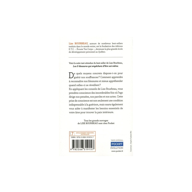 A l'aide de multiples exemples, l'auteure partage dans ce présent ouvrage ses nombreuses découvertes professionnelles et expériences personnelles qui guideront les personnes à la recherche de moyens concrets pour guérir leurs souffrances. Les lecteurs apprendront à reconnaître les mécanismes des blessures et à mieux cerner quand celles-ci sont activées. En appliquant les conseils suggérés, ils prendront conscience des innombrables occasions où l'ego dirige leurs pensées, leurs paroles et leurs actes.