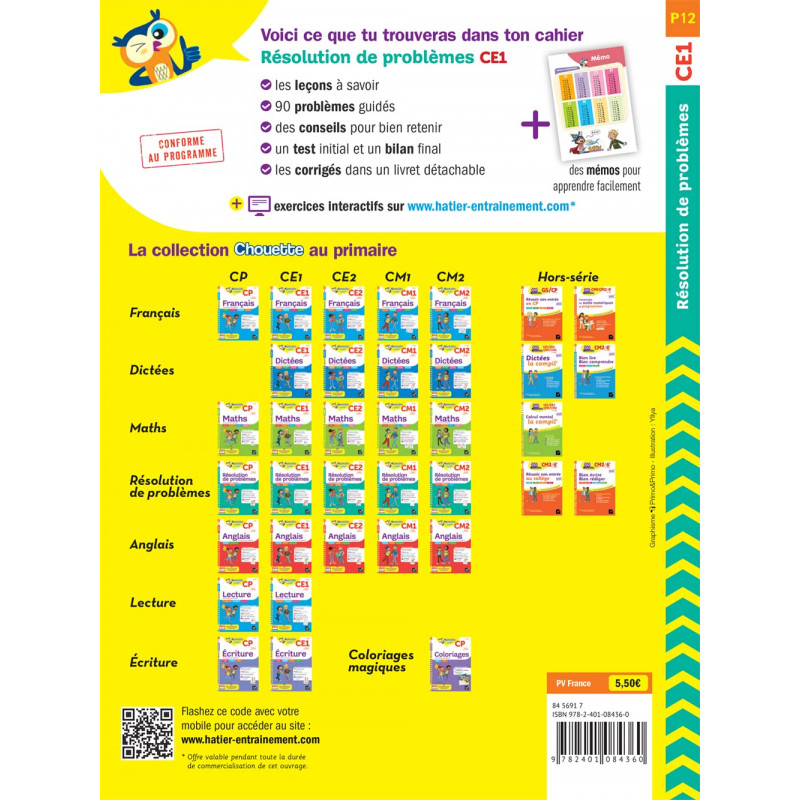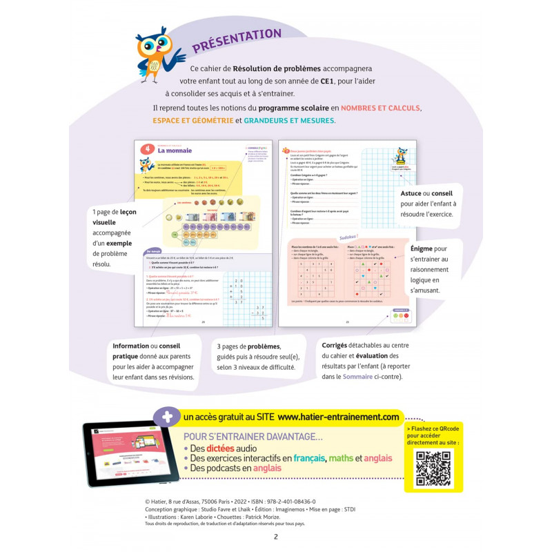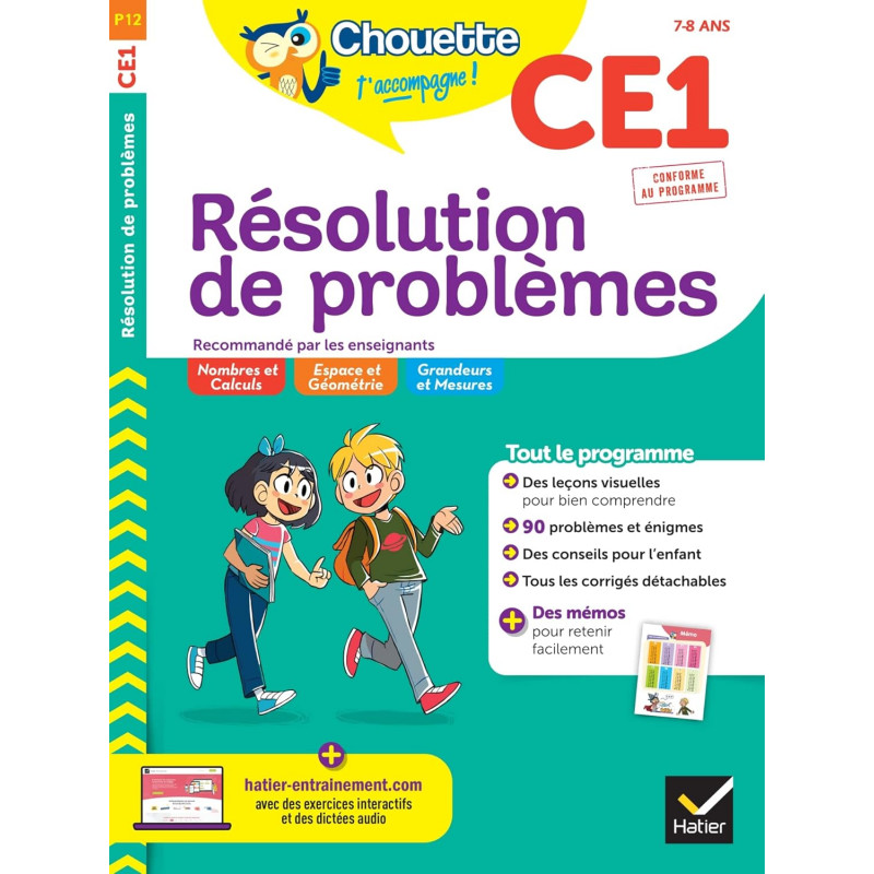 Voici ce que tu trouveras dans ton cahier Résolution de problèmes CE1 : les leçons à savoir ; 90 problèmes guidés ; des conseils pour bien retenir ; un test initial et un bilan final ; les corrigés dans un livret détachable ; + des mémos pour apprendre facilement + exercices interactifs sur www.hatier-entrainement.com.