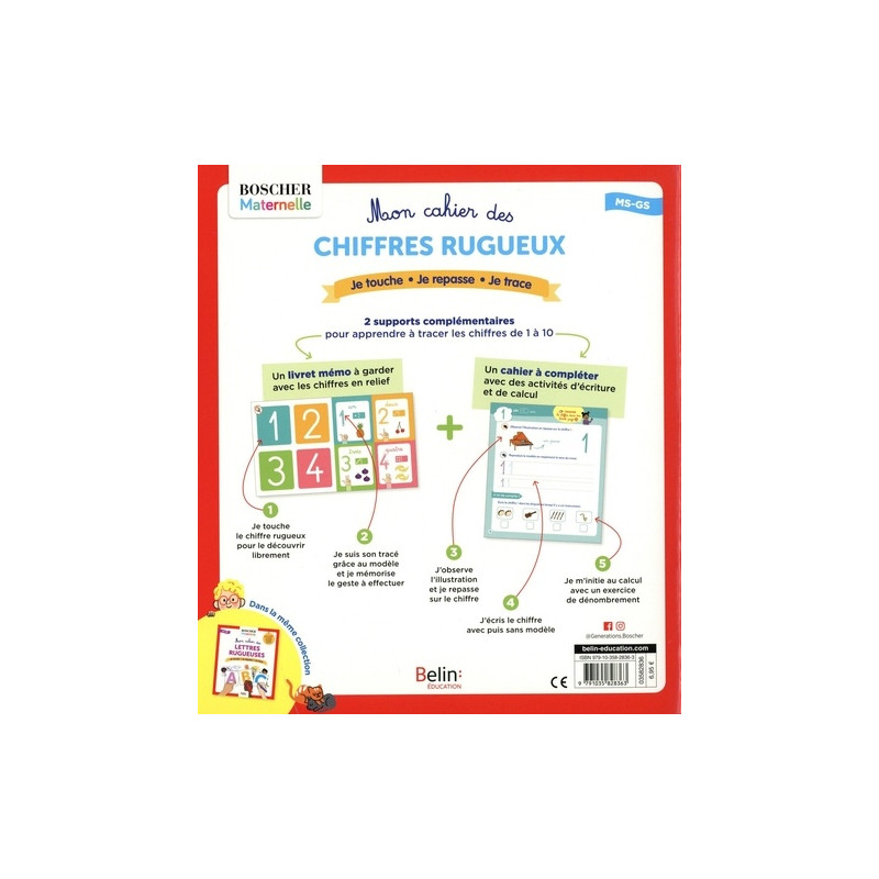 En mettant en avant la gestuelle, elle facilite la mémorisation des mouvements. Des conseils et des exercices d'échauffement de la main et du poignet sont proposés au début de l'ouvrage pour que votre enfant puisse se mettre au travail dans de bonnes conditions. L'utilisation des deux supports en parallèle permet à votre enfant de se familiariser en douceur avec les chiffres et leur manipulation. Sur le livret : - il touche le chiffre rugueux librement ; - il suit son tracé avec le doigt grâce aux flèches.