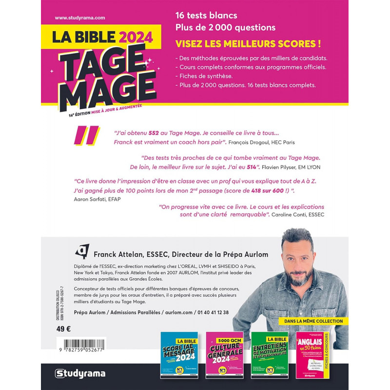 La Bible du Tage Mage® est l'ouvrage de référence qui vous accompagnera tout au long de votre préparation au Tage Mage®. Vous y trouverez 15 tests blancs complets. Au total : plus de 2 500 questions et applications-clés... De quoi progresser rapidement dans chacune des 6 épreuves du Tage Mage® et espérer ainsi terminer parmi les premiers !