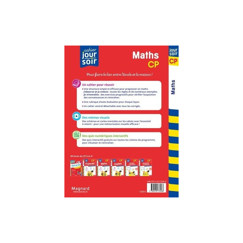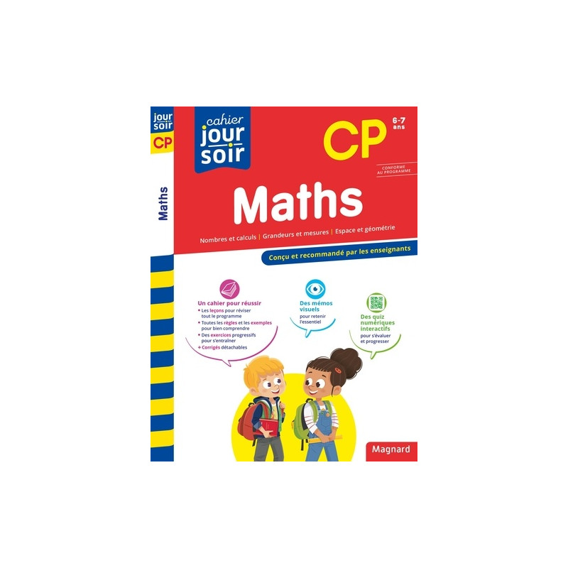 Un cahier complet pour progresser en maths au CP Réviser tout le programme de CP et s'entraîner - Nombres et calculs / Grandeurs et mesures / Espace et géométrie - Une structure simple et efficace adaptée aux élèves de CP - Des leçons illustrées et claires - Des exercices progressifs et variés - Des corrigés détachables + Des mémos visuels pour mémoriser facilement l'essentiel : les unités et les dizaines, le tableau des nombres, les tables d'addition, la technique de l'addition (sans retenue et avec retenue), les longueurs, les masses, les figures planes, les solides...