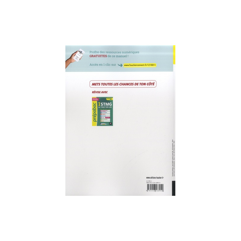 Un manuel consommable de droit pour les élèves de 1re STMG, qui s'appuie sur des situations proches du quotidien des élèves et des activités attractives. - Des entrées de chapitre dynamiques en vidéo - Un cours privilégiant la mise en activité des élèves - Des documents variés (schémas, textes, photos ou tableaux) - Une synthèse de chapitre proposée sous plusieurs formes : en schéma, en audio, à l'écrit - Des entraînements progressifs et efficaces en vue de la préparation du Bac - Des fiches méthode pour s'approprier les techniques à maîtriser - Une situation filée par chapitre proche du quotidien des élèves - Des pages d'activités enrichies de blocs "Notions" et d'encadrés citant les textes juridiques - Des outils pour s'approprier le vocabulaire juridique : flashcards numériques, définitions des mots-clés, lexique - 5 sujets types Bac : 1 par thème + 1 transversal.