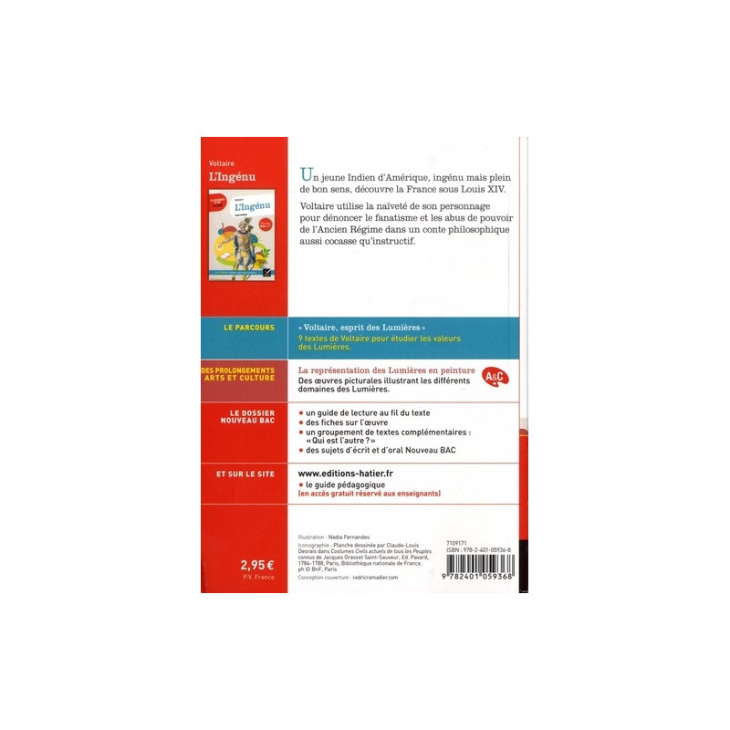 Un conte philosophique majeur, suivi d'un parcours littéraire " Voltaire, esprit des Lumières " . Dans une édition conforme aux nouveaux programmes de français du lycée, incluant notamment des prolongements artistiques et culturels et un dossier Nouveau bac. L'œuvre Un jeune Indien d'Amérique découvre la France sous Louis XIV. C'est l'occasion pour Voltaire d'interroger les préjugés de la société sous l'Ancien Régime et de livrer un vibrant plaidoyer en faveur de la tolérance.