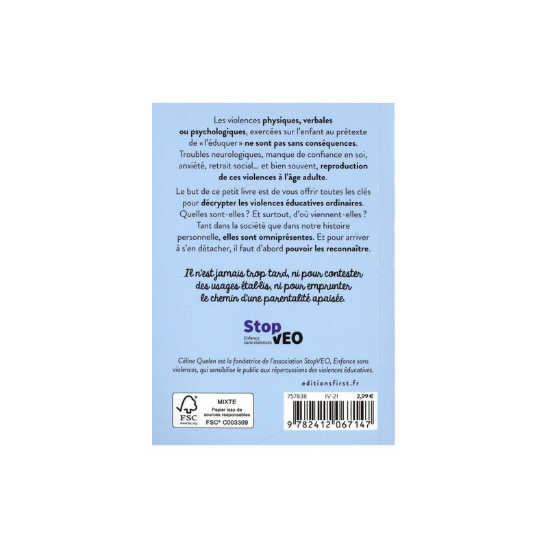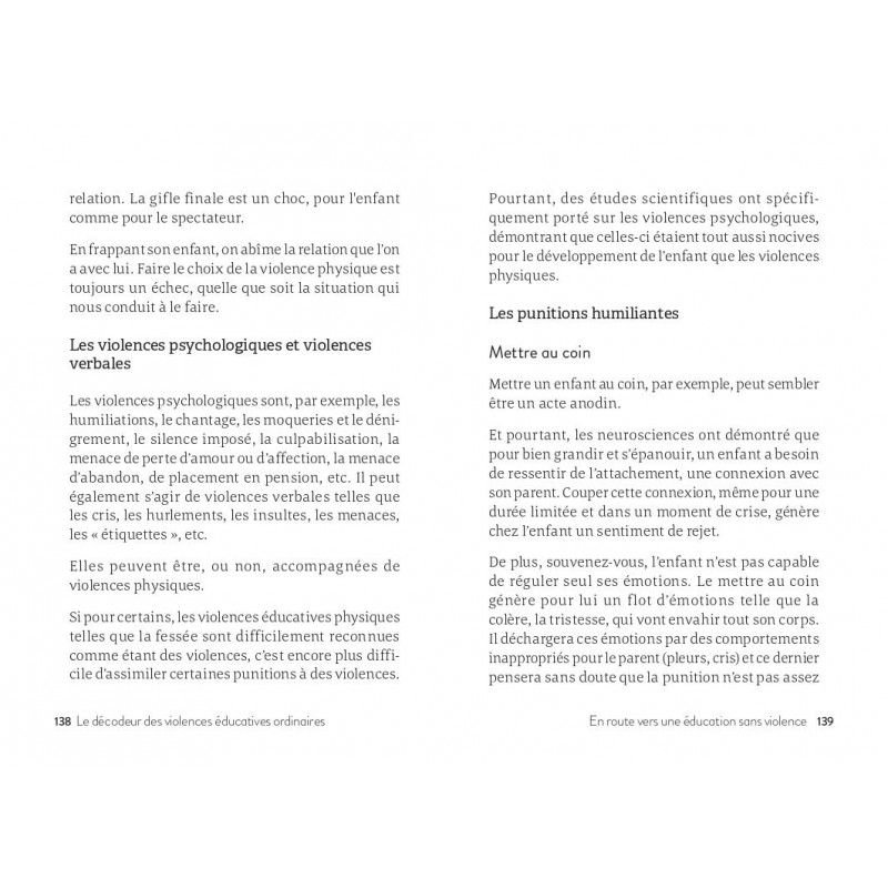 Les violences physiques, verbales ou psychologiques, exercées sur l'enfant au prétexte de "l'éduquer" ne sont pas sans conséquences. Troubles neurologiques, manque de confiance en soi, anxiété, retrait social... et bien souvent, reproduction de ces violences à l'âge adulte. Le but de ce petit livre est de vous offrir toutes les clés pour décrypter les violences éducatives ordinaires. Quelles sont-elles ? Et surtout, d'où viennent-elles ? Tant dans la société que dans notre histoire personnelle, elles sont omniprésentes.