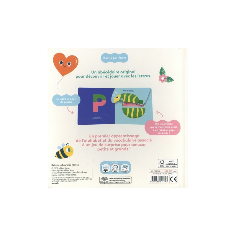 Un premier d'abécédaire à flaps pour apprendre en s'amusant : la lettre en page de gauche et, en page de droite, une illustration d'un mot commençant par cette lettre qui se transforme en une autre illustration (d'un autre mot, commençant également par cette lettre) grâce à des rabats. Un premier apprentissage de l'alphabet et du vocabulaire associé à un jeu de surprise pour amuser petits et grands !