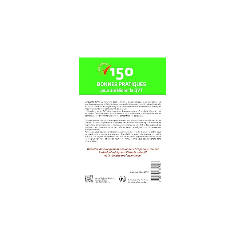 La Qualité de Vie au Travail ne peut se résumer à quelques appâts ou accessoires tels que des massages ou le baby-foot qui sont périphériques au travail. La Qualité de Vie au Travail demande à intégrer l'organisation et le contenu du travail en lui-même, en s'appuyant sur le vécu et le ressenti de chacun. e. Le lien direct entre QVT et performance des organisations n'est plus à démontrer et les progrès fantastiques des neurosciences et de la psychologie positive confirment les nombreux enseignements que l'auteur concentre dans ces pages.