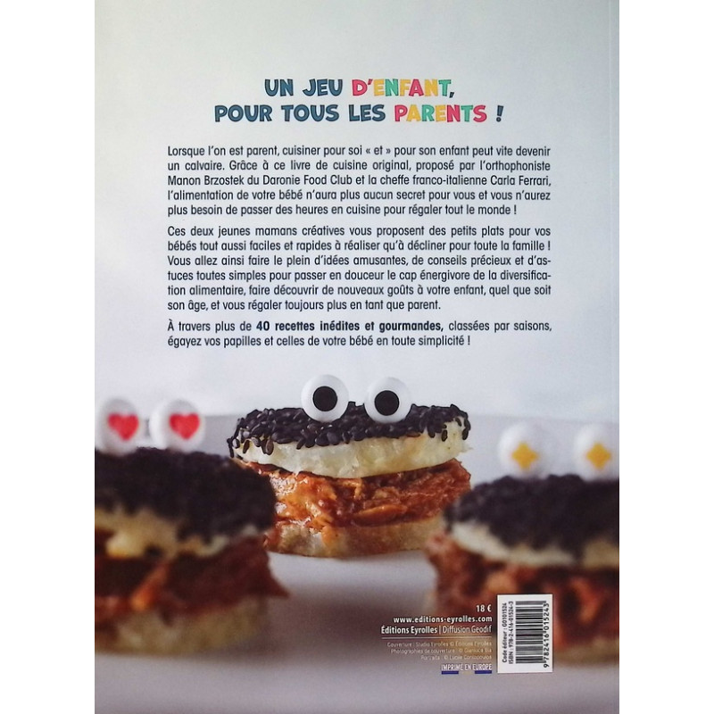 Un jeu d'enfant, pour tous les parents ! " Dans ce livre, vous l'aurez compris, on vous propose de passer à table avec votre bébé. Mais avant de glisser ses cuissots dodus sous la table, il va falloir que vous décidiez quand et quoi mettre dans son assiette. Et si je vous disais que ça pouvait être le même plat que dans la vôtre ? Et si je vous disais que toute cette aventure culinaire pouvait être aussi simple que rigolote ? Avant de passer en cuisine, explorons les bases de la diversification alimentaire la plus cool possible ! " Lorsque l'on est parent, cuisiner pour soi " et " pour bébé peut vite devenir un calvaire ! Alors pour ne pas avoir à choisir entre le plaisir et le confort de l'un au détriment de l'autre, Manon et Carla ont conçu ce livre de cuisine original et adapté à toutes les attentes.