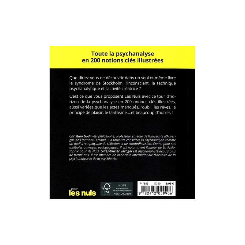 Toute la psychanalyse en 200 notions clés illustrées. Que diriez-vous de découvrir dans un seul et même livre le syndrome de Stockholm, l'inconscient, la technique psychanalytique et l'activité créatrice ? C'est ce que vous proposent Les Nuls avec ce tour d'horizon de la psychanalyse en 200 notions clés illustrées, aussi variées que les actes manqués, l'oubli, les rêves, le principe de plaisir, le fantasme...