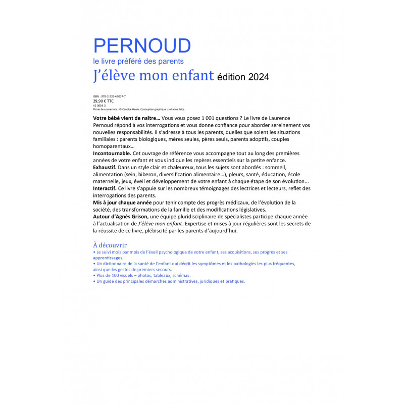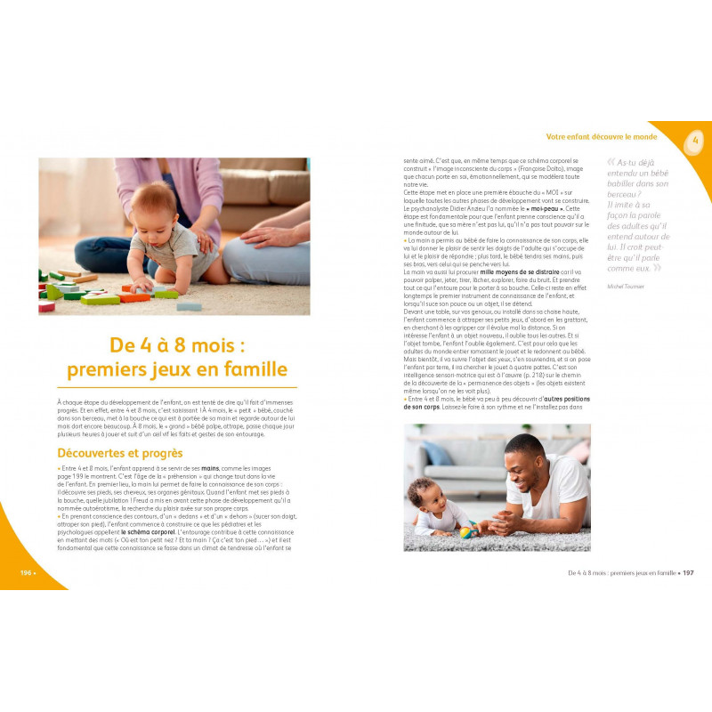 Exhaustif. Dans un style clair et chaleureux, tous les sujets sont abordés : sommeil, alimentation (sein, biberon, diversification alimentaire...), pleurs, santé, éducation, école maternelle, jeux, éveil et développement de votre enfant à chaque étape de son évolution... Interactif. Ce livre s'appuie sur les nombreux témoignages des lectrices et lecteurs, reflet des interrogations des parents. Mis à jour chaque année pour tenir compte des progrès médicaux, de l'évolution de la société, des transformations de la famille et des modifications législatives.