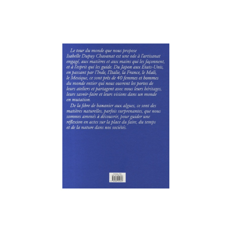 Le tour du monde que nous propose Isabelle Dupuy Chavanat est une ode à l'artisanat engagé, aux matières et aux mains qui les façonnent, et à l'esprit qui les guide. Du Japon aux Etats-Unis, en passant par l'Inde, l'Italie, la France, le Mali, le Mexique, ce sont près de 40 femmes et hommes du monde entier qui nous ouvrent les portes de leurs ateliers et partagent avec nous leurs héritages, leurs savoir-faire et leurs visions dans un monde en mutation.