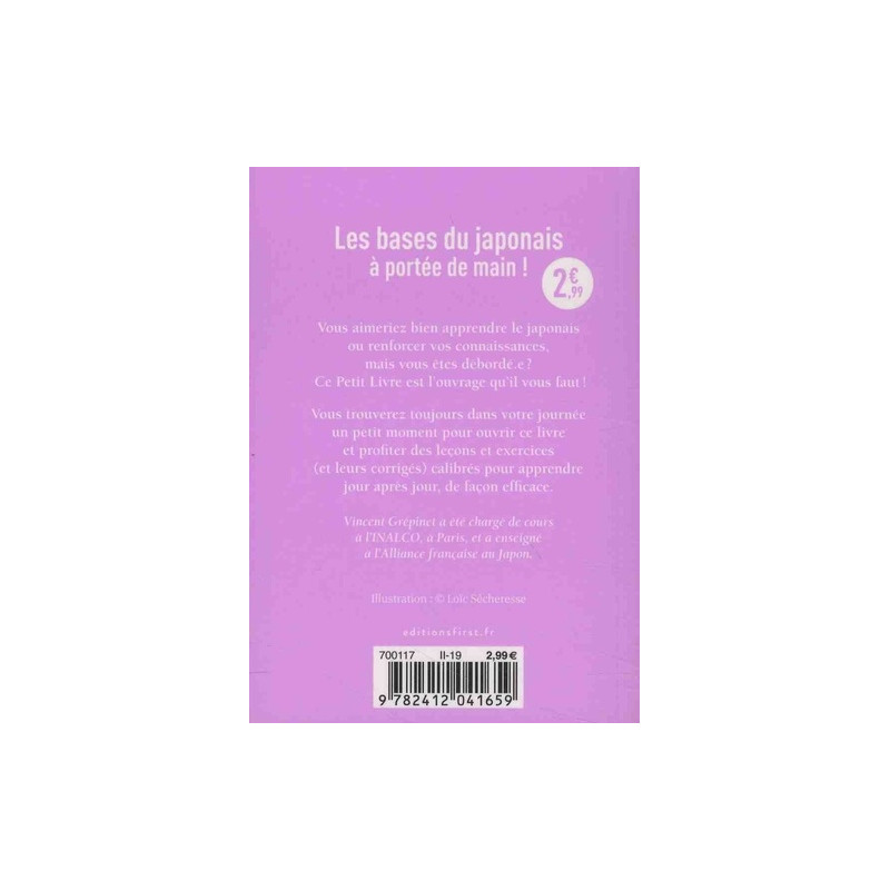 Les bases du japonais à portée de main ! Vous aimeriez bien apprendre le japonais ou renforcer vos connaissances, mais vous êtes débordée ? Ce Petit Livre est l'ouvrage qu'il vous faut ! Vous trouverez toujours dans votre journée un petit moment pour ouvrir ce livre et profiter des leçons et exercices (et leurs corrigés) calibrés pour apprendre jour après jour, de façon efficace.