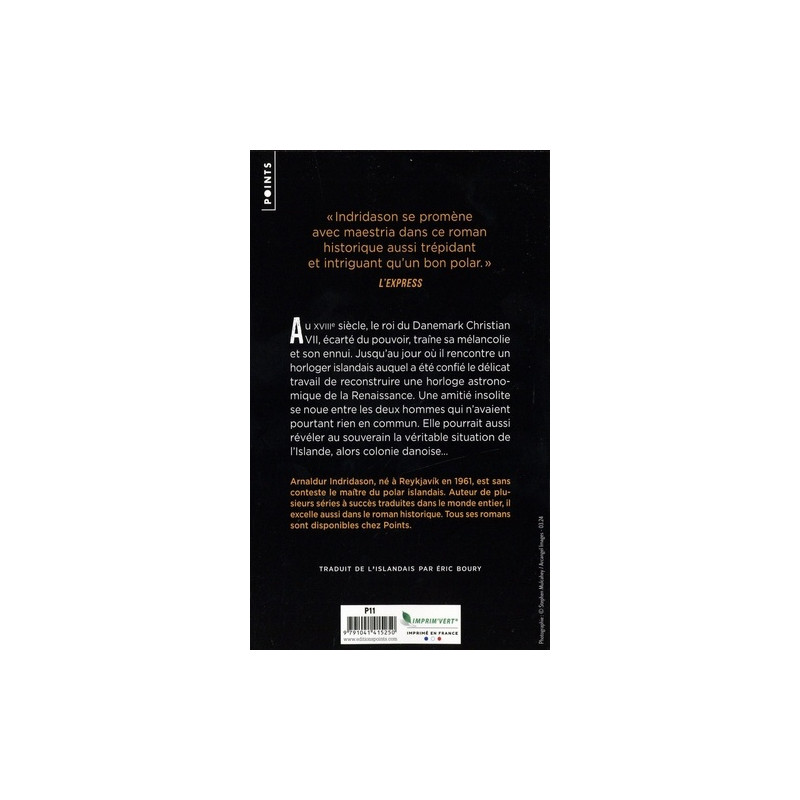 Remonter le temps... Un surprenant roman noir historique à la fin du XVIIIème siècle, entre Copenhague et la campagne isolée du Nord-Ouest de l'Islande. Au XVIIIe siècle, le roi du Danemark Christian VII, écarté du pouvoir, traîne sa mélancolie et son ennui. Jusqu'au jour où il rencontre un horloger islandais auquel a été confié le délicat travail de reconstruire une horloge astronomique de la Renaissance.