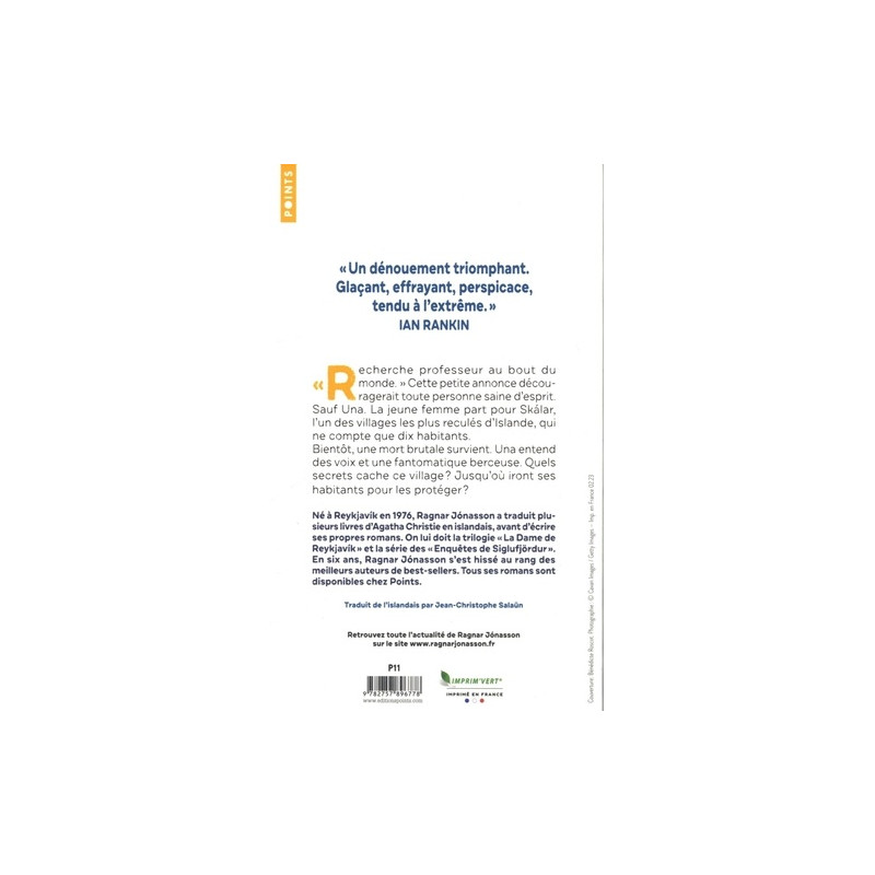 "Recherche professeur au bout du monde". Cette petite annonce découragerait toute personne saine d'esprit. Sauf Una. La jeune femme part pour Skálar, l'un des villages les plus reculés d'Islande, qui ne compte que dix habitants. Bientôt, une mort brutale survient. Una entend des voix et une fantomatique berceuse. Quels secrets cache ce village ? Jusqu'où iront ses habitants pour les protéger ?
