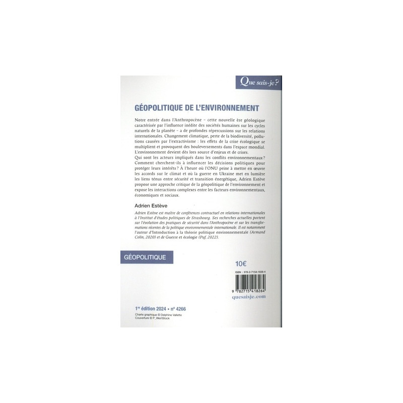 L'environnement devient dès lors source d'enjeux et de crises. Qui sont les acteurs impliqués dans les conflits environnementaux ? Comment cherchent-ils à influencer les décisions politiques pour protéger leurs intérêts ? A l'heure où l'ONU peine à mettre en œuvre les accords sur le climat et où la guerre en Ukraine met en lumière les liens ténus entre sécurité et transition énergétique, Adrien Estève propose une approche critique de la géopolitique de l'environnement et expose les interactions complexes entre les facteurs environnementaux, économiques et sociaux.