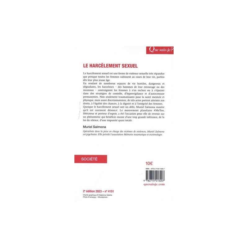 Non seulement traumatisants pour la santé mentale et physique, mais aussi discriminatoires, de tels actes portent atteinte aux droits, à l'égalité des chances, à la dignité et à l'intégrité des femmes. Quoique le harcèlement sexuel soit un délit, Muriel Salmona montre qu'il est rarement dénoncé. Le mouvement planétaire #MeToo, libérateur et porteur d'espoir, a été l'occasion pour elle de revenir sur un phénomène qui bénéficie encore d'une trop grande tolérance, de la loi du silence, d'une impunité quasi totale.