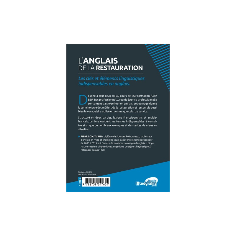 Ce livre donne la terminologie des métiers de la restauration en anglais et rassemble aussi bien le vocabulaire utilisé en cuisine que celui du service. Structuré en deux parties, lexique français-anglais et anglais-français, il contient les termes indispensables à connaître ainsi que de nombreux exemples et des textes de mises en situation.