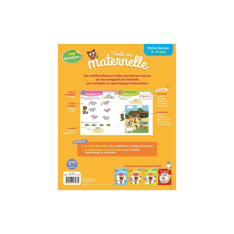Le cahier N°1 de la Maternelle, pour bien accompagner son enfant tout au long de l'année ! - 88 fiches d'activités simples et ludiques, conformes au programme. - Plus de 110 autocollants, des illustrations attrayantes et des thèmes amusants pour encourager l'enfant et le stimuler. - Un poster à détacher et à afficher : au recto, l'alphabet ; au verso, le vocabulaire de la maison joliment illustré.