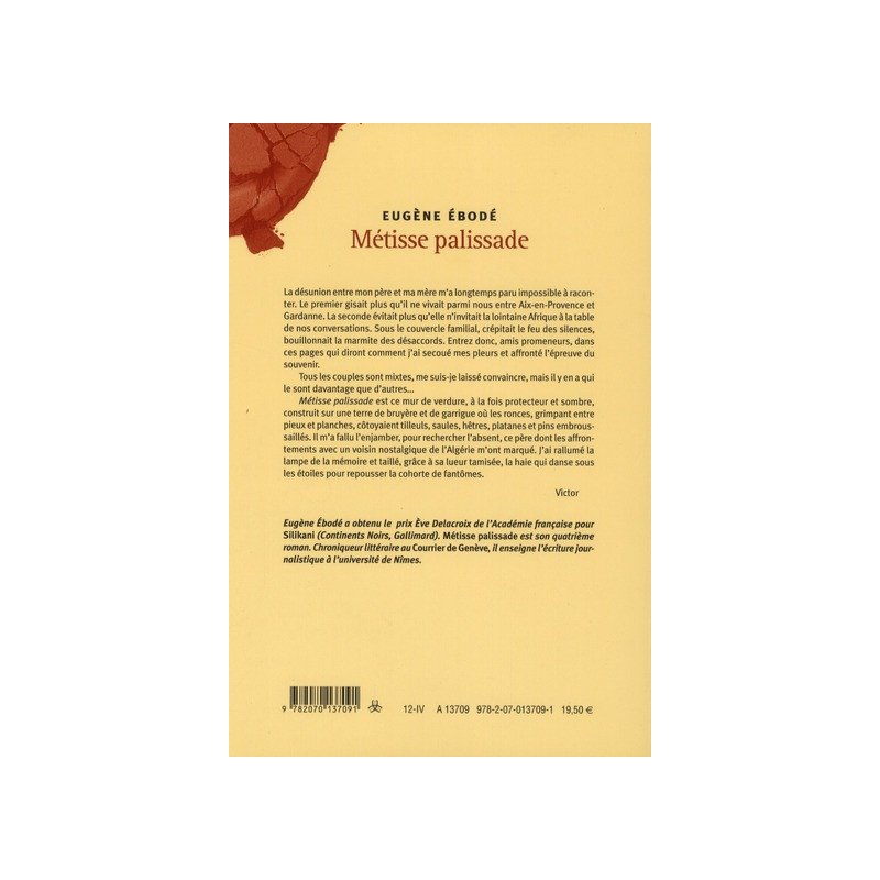 Tous les couples sont mixtes, me suis-je laissé convaincre, mais il y en a qui le sont davantage que d'autres... Métisse palissade est ce mur de verdure, à la fois protecteur et sombre, construit sur une terre de bruyère et de garrigue où les ronces, grimpant entre pieux et planches, côtoyaient tilleuls, saules, hêtres, platanes et pins embroussaillés. Il m'a fallu l'enjamber, pour rechercher l'absent, ce père dont les affrontements avec un voisin nostalgique de l'Algérie m'ont marqué.