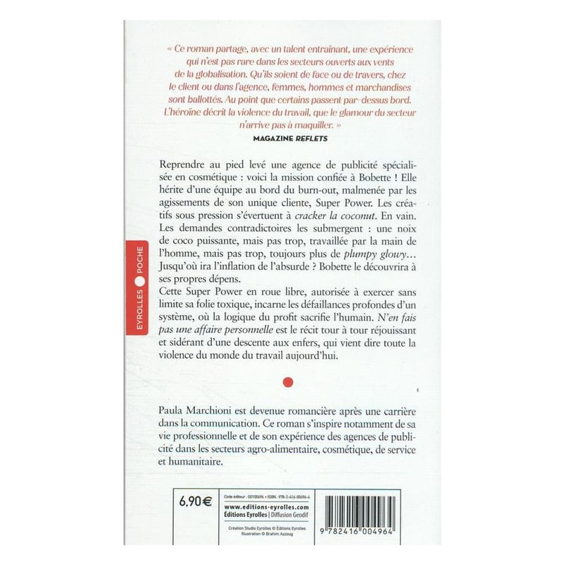 Jusqu'où ira l'inflation de l'absurde ? Bobette le découvrira à ses propres dépens. Cette Super Power en roue libre, autorisée à exercer sans limite sa folie toxique, incarne les défaillances profondes d'un système, où la logique du profit sacrifie l'humain. N'en fais pas une affaire personnelle est le récit tour à tour réjouissant et sidérant d'une descente aux enfers, qui vient dire toute la violence du monde du travail aujourd'hui.