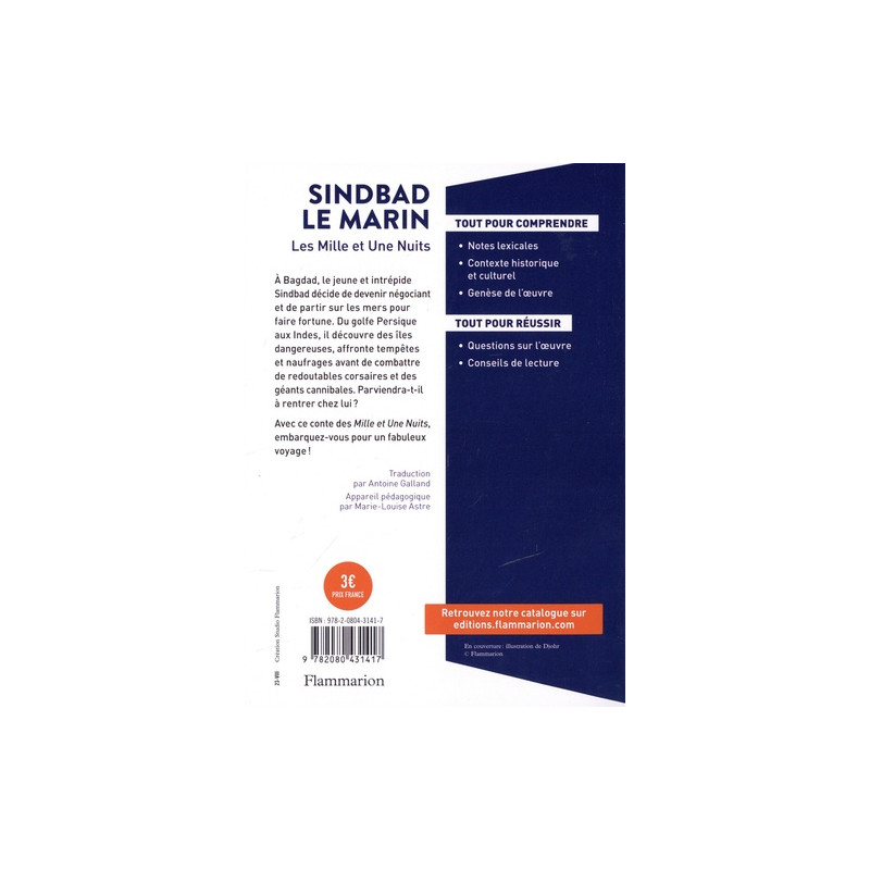 A Bagdad, le jeune et intrépide Sindbad décide de devenir négociant et de partir sur les mers pour faire fortune. Du golfe Persique aux Indes, il découvre des îles dangereuses, affronte tempêtes et naufrages avant de combattre de redoutables corsaires et des géants cannibales. Parviendra-t-il à rentrer chez lui ? Avec ce conte des Mille et Une Nuits, embarquez-vous pour un fabuleux voyage ! TOUT POUR COMPRENDRE - Notes lexicales - Contexte historique et culturel - Genèse de l'œuvre TOUT POUR REUSSIR - Questions sur l'œuvre - Conseils de lecture.