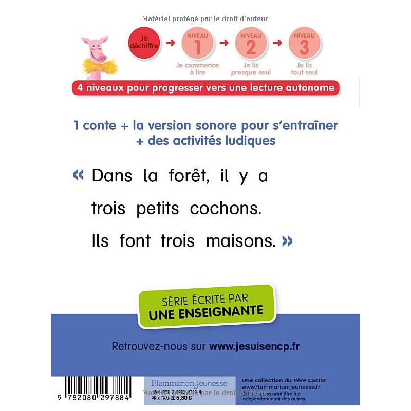 "Dans la forêt, il y a trois petits cochons. Ils font trois maisons". 1 conte + la version sonore pour s'entraîner + des activités ludiques.