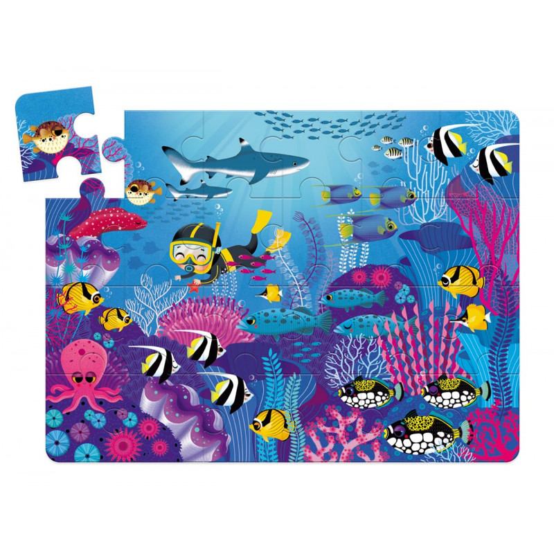 1 puzzle grand format de 24 pièces à réaliser, pour découvrir une belle image sur le thème de l'océan. Inclus, le modèle taille réelle pour guider l'enfant.