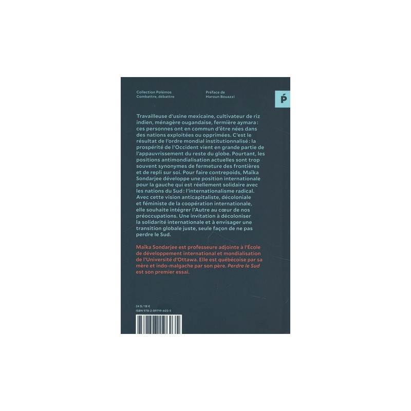 Pour faire contrepoids, Maïka Sondarjee développe une position internationale pour la gauche qui est réellement solidaire avec les nations du Sud : l'internationalisme radical. Avec cette vision anticapitaliste, décoloniale et féministe de la coopération internationale, elle souhaite intégrer l'Autre au cœur de nos préoccupations. Une invitation à décoloniser la solidarité internationale et à envisager une transition globale juste, seule façon de ne pas perdre le Sud.