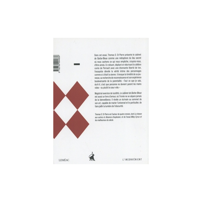 Tout ce que je sais, écrit-il, c'est que personne ne devient parent les mains vides - ou plutôt le cœur vide. Magistral exercice de lucidité, Le cabinet de Barbe-Bleue est aussi un livre d'amour, où l'ironie ne se sépare jamais de la bienveillance. Il révèle un écrivain au sommet de son art, capable de marier l'universel et le particulier, de faire jaillir la lumière de l'obscurité. m LEMEAC L'INCONVENIENT