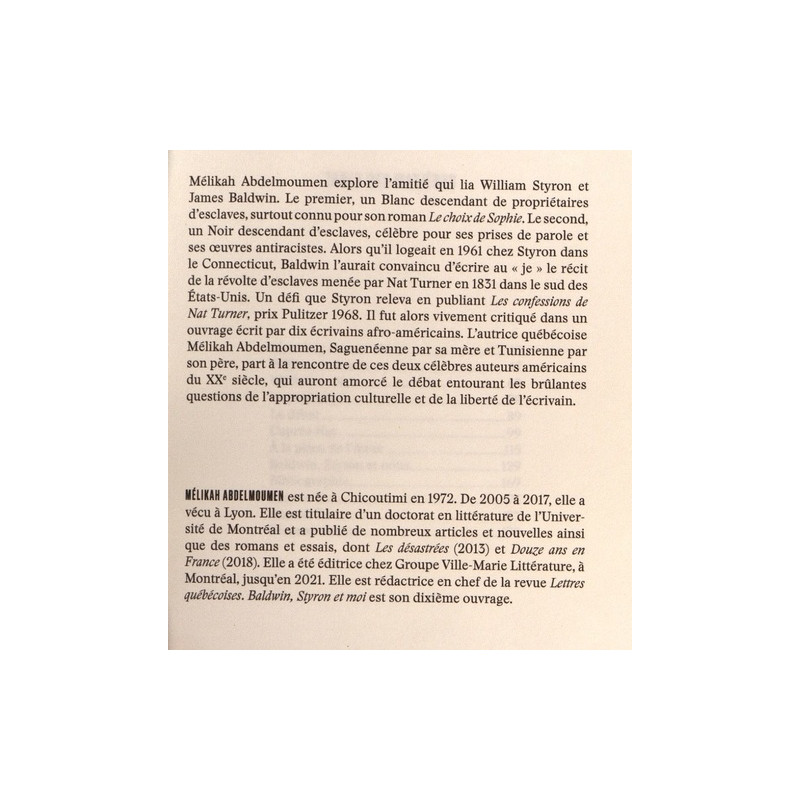 Un dé? que Styron releva en publiant Les confessions de Nat Turner, prix Pulitzer 1968. Il fut alors vivement critiqué dans un ouvrage écrit par dix écrivains afro-américains. L'autrice québécoise Mélikah Abdelmoumen, Saguenéenne par sa mère et Tunisienne par son père, part à la rencontre de ces deux célèbres auteurs américains du XXe siècle, qui auront amorcé le débat entourant les brûlantes questions de l'appropriation culturelle et de la liberté de l'écrivain