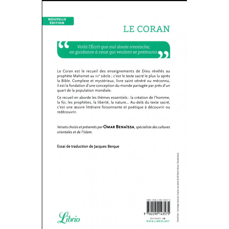 Le Coran est le recueil des enseignements de Dieu révélés au prophète Mahomet au VIIe siècle ; c'est le texte sacré le plus lu après la Bible. Complexe et mystérieux, livre saint vénéré ou méconnu, il est la fondation d'une conception du monde partagée par près d'un quart de la population mondiale. Ce recueil en aborde les thèmes essentiels : la création de l'homme, la foi, les prophètes, la liberté, la nature...