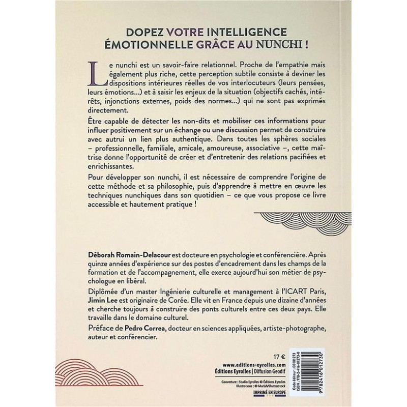 Il est important de dire que le nunchi est une compétence psychosociale qui peut s'acquérir, et la développer permet de vivre en harmonie avec le monde qui nous entoure. Pour ce faire, deux étapes sont nécessaires : 1/ comprendre l'origine du nunchi et sa philosophie 2/ apprendre à mettre en œuvre les techniques nunchiques dans son quotidien. Ce que vous propose ce livre accessible et hautement pratique !