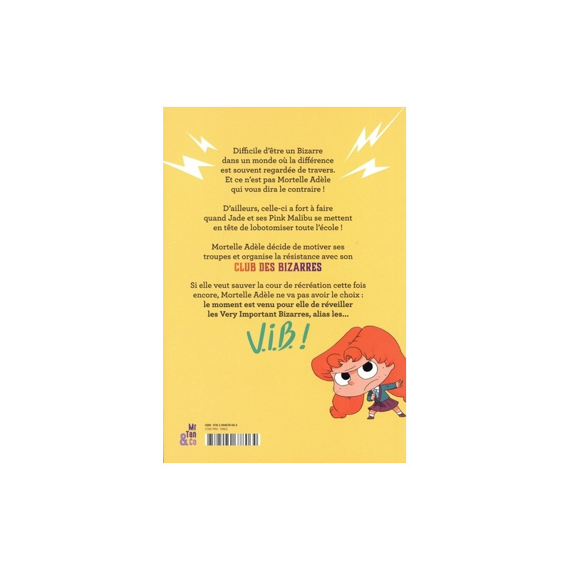 Le 4ème tome des romans illustrés de Mortelle Adèle : Libère toute ta mortellitude et deviens VIB ! Dans la cour de récréation, c'est le bazar : impossible d'échapper aux injonctions du Club des Pink Malibu, mené par Jade et Miranda. Les deux pestes ont toujours un avis à donner sans que personne ne leur demande rien ! Alors que le Club des Bizarres de Mortelle Adèle intronise Louis, son nouveau membre, ce dernier se fait paillettiser par Jade, bien décidée à gâcher la fête et embêter ses camarades ! Force est de constater que les deux clans ont des visions diamétralement opposées du monde et cette fois c'en est trop, la guerre est déclarée ! Mais pour se mesurer à ces courges mutantes et leurs bombes à paillettes, Adele ne va pas avoir d'autres choix que d'ouvrir en grand les portes de son Club des Bizarres ! Objectif : Former les VIB, les Very Important Bizarres, des enfants aux taux de mortellitude si élevée que la cour de récréation pourrait bien devenir l'endroit le plus MORTEL de la planète !