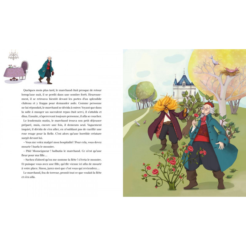 Il était une fois, un riche marchand dont la fille cadette était si jolie que tout le monde la surnommait "La Belle". L'homme, parti pour un long voyage, se perdit dans une sombre forêt. Heureusement, il se retrouva bientôt devant un splendide château. Il y dîna, se coucha et demeura seul. Puis, inquiet de ne rencontrer personne, il décida de s'en aller. C'est alors qu'une horrible créature surgit devant lui...