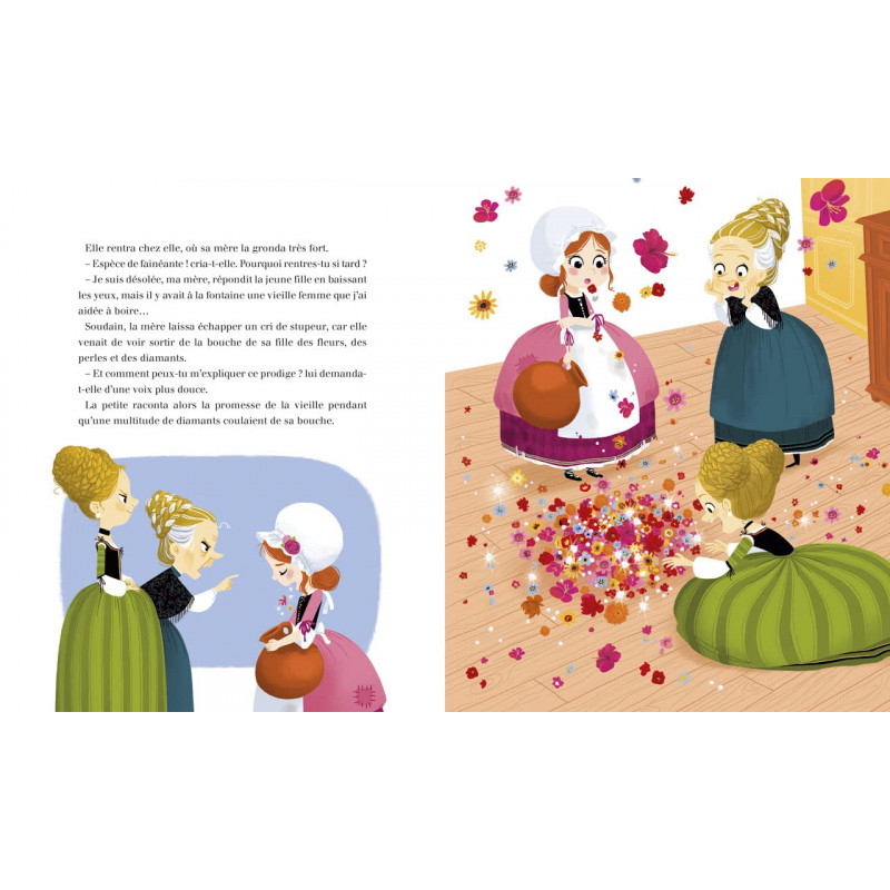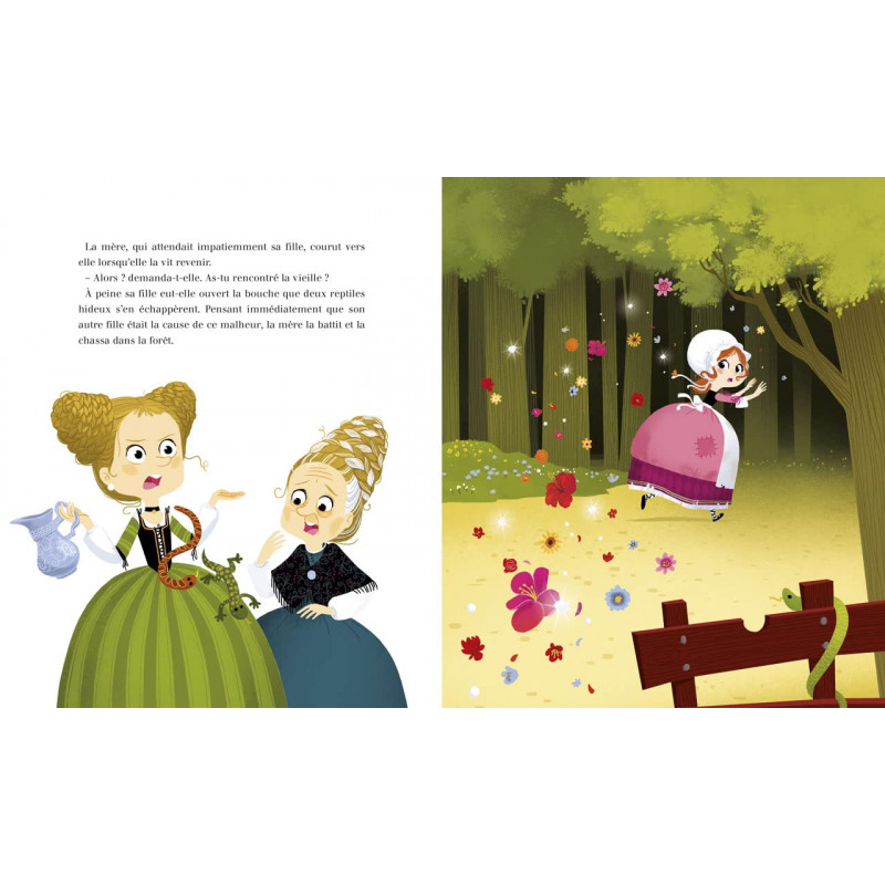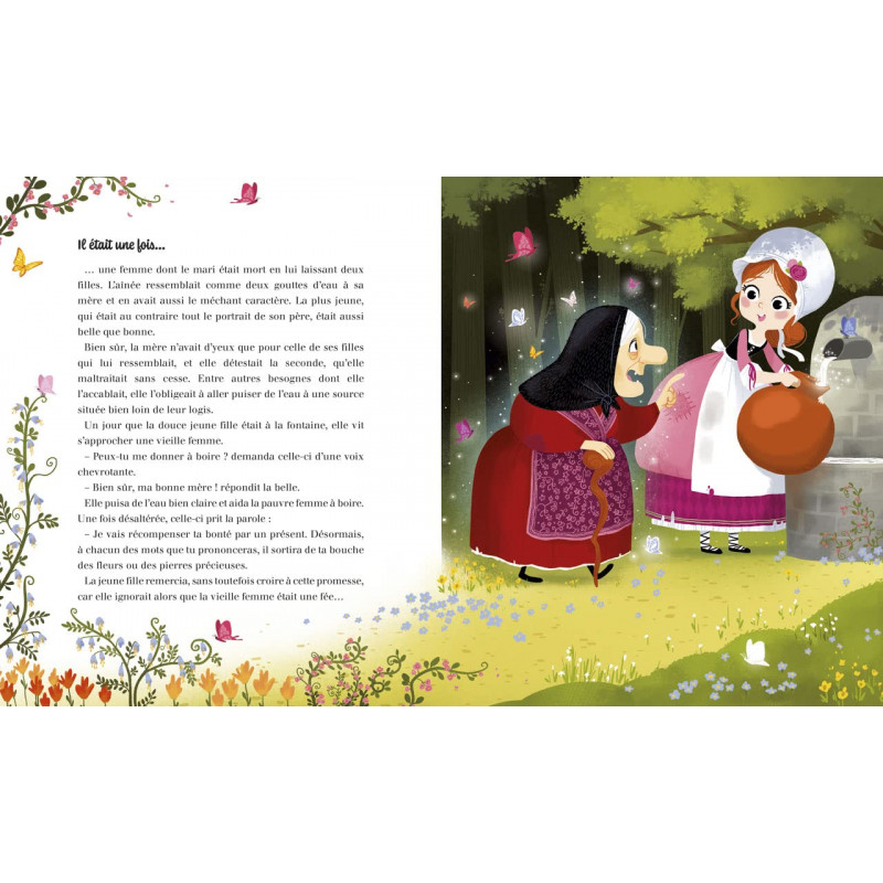 Il était une fois une méchante veuve qui vivait avec ses deux filles. L'aînée ressemblait à sa vilaine mère tandis que la plus jeune était belle et pleine de bonté. La mère détestait la seconde, qu'elle maltraitait sans cesse. Un jour que cette dernière était à la fontaine, elle vit s'approcher une vieille femme. Elle ignorait que c'était une fée...