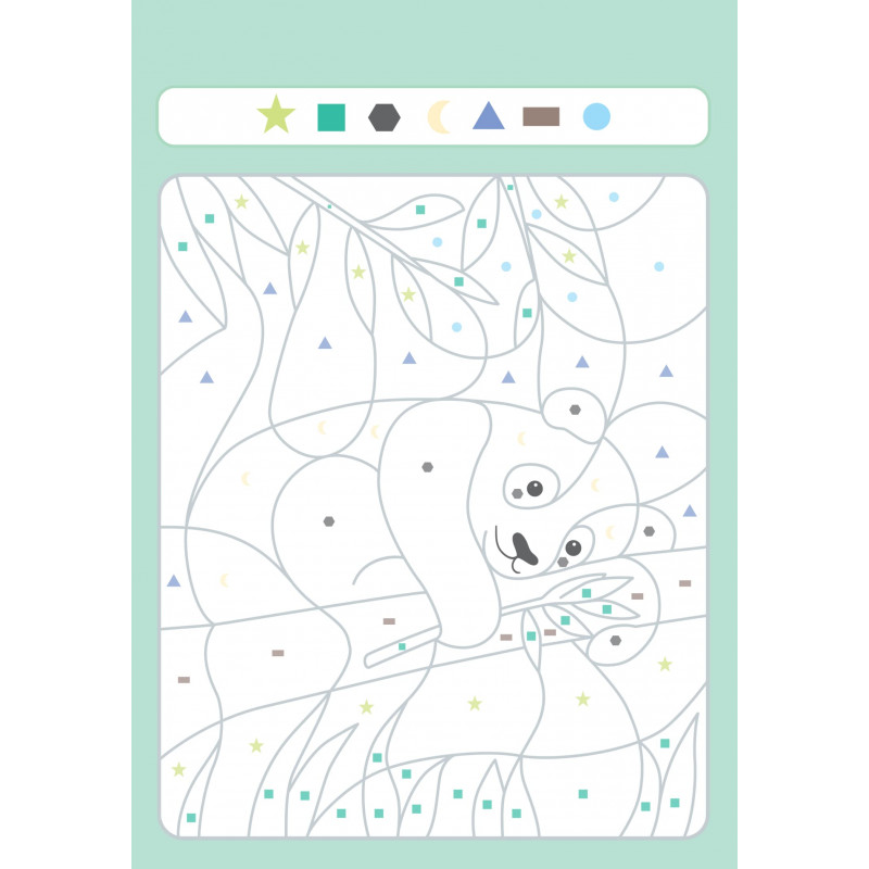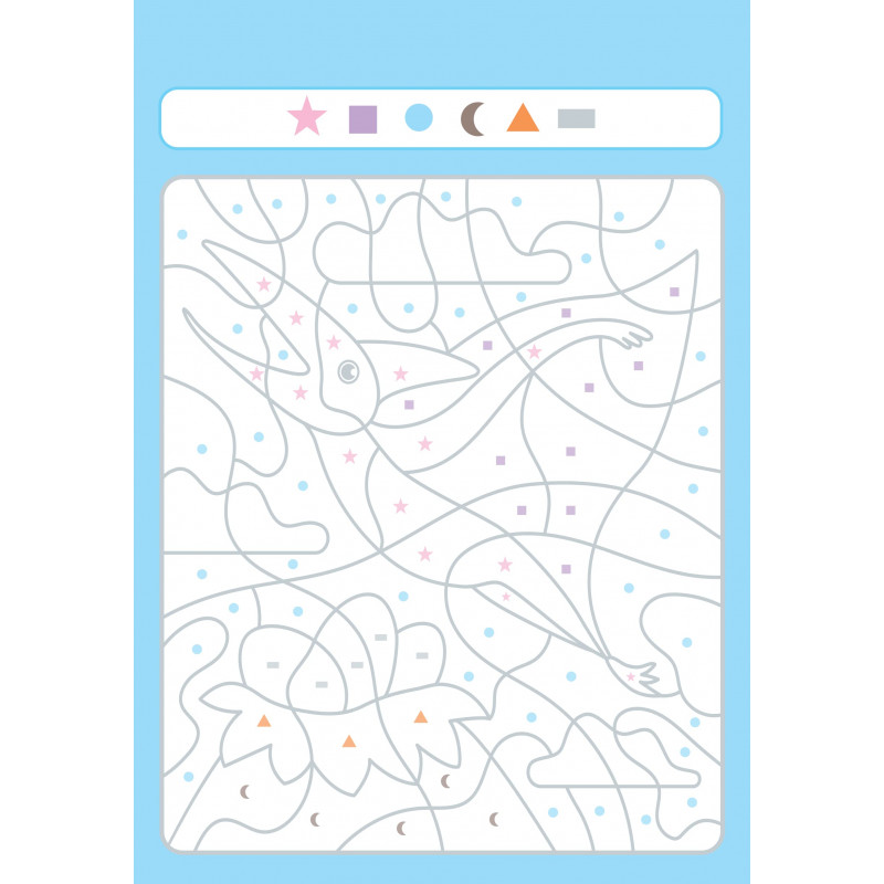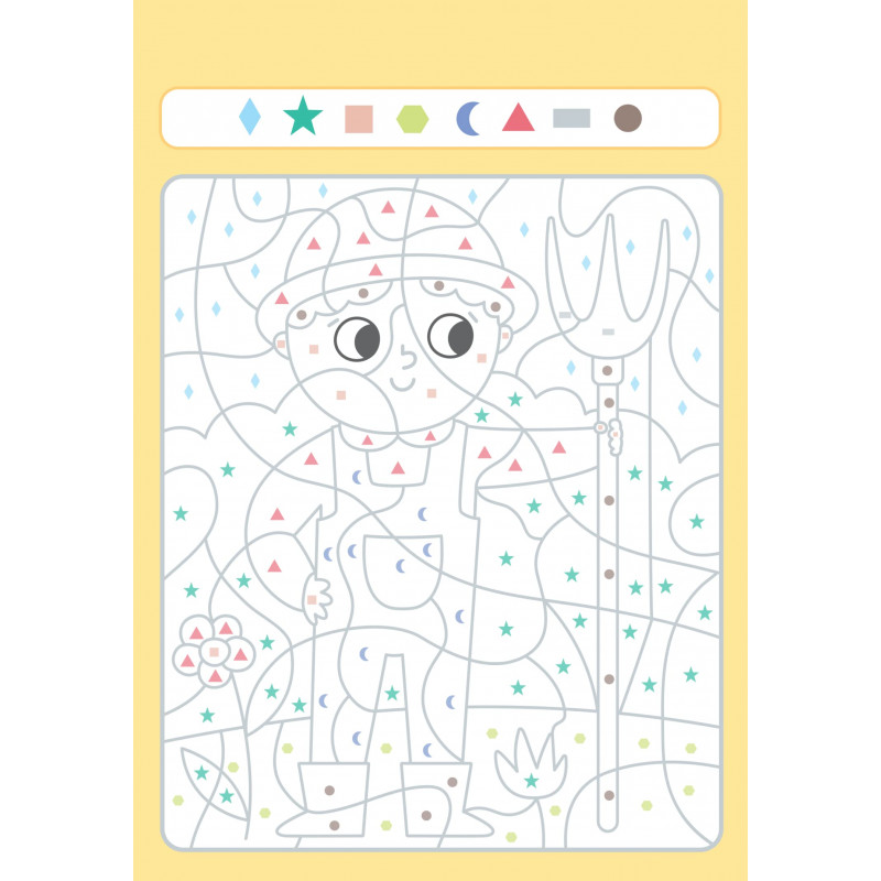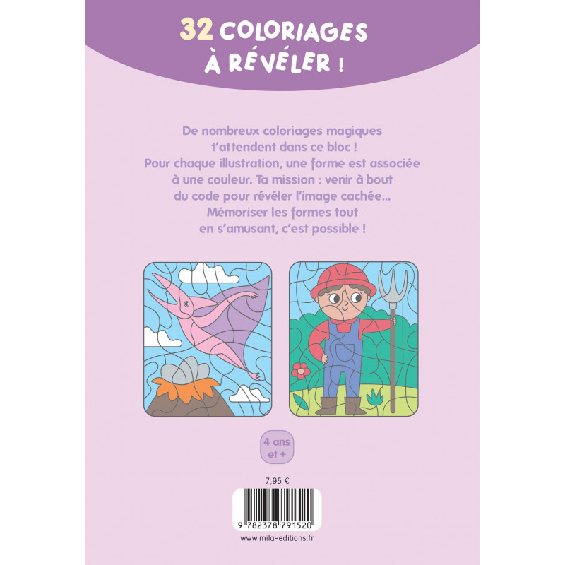 Des coloriages mystère pour une surprise renouvelée ! Le livre se présente sous la forme d'un bloc avec 32 coloriages surprise à dévoiler et à détacher ! Chaque illustration contient des cases codées avec des formes qui correspondent a des couleurs précises, il faut trouver le bon code pour faire apparaître le dessin et révéler quel animal, objet ou scène se cache derrière le code ! C'est un ouvrage amusant qui aidera l'enfant à reconnaître les formes tout en coloriant !