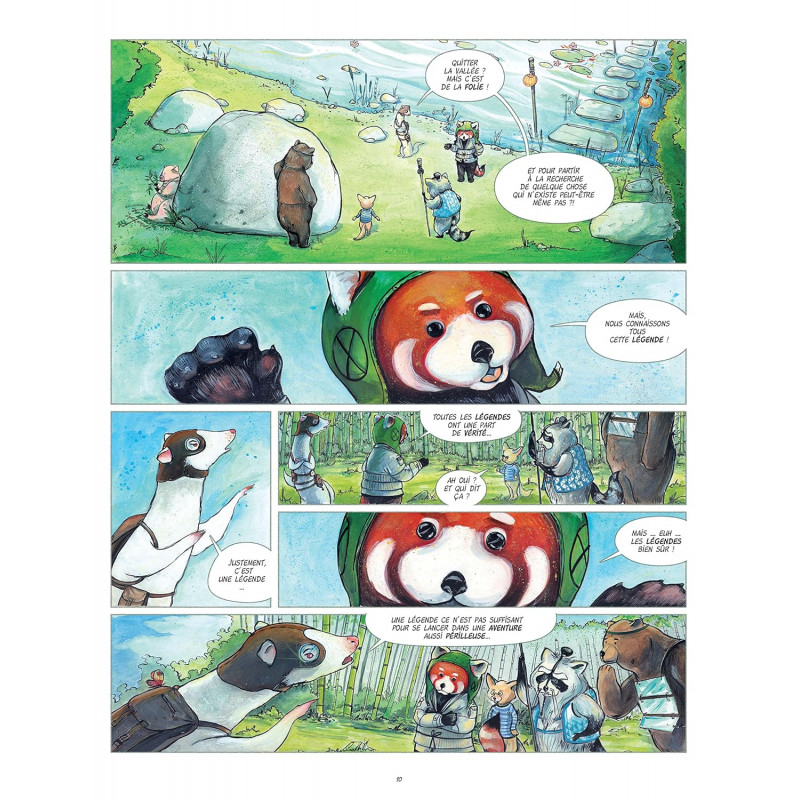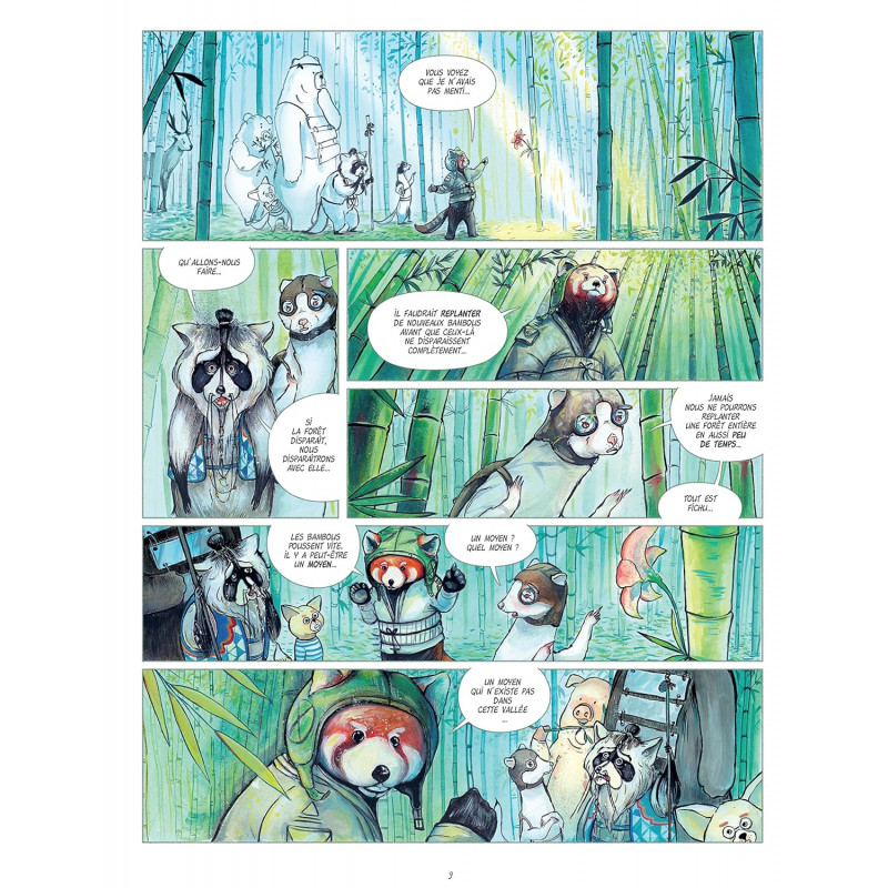 Dans la vallée des bambous, tous les animaux sont en émoi, car aujourd'hui une fleur est née ! Mais lorsqu'un bambou fleurit, c'est qu'il va mourir ! Vous ne le saviez donc pas ? Bientôt, c'est toute la forêt qui va fleurir avec lui. La fouine et le panda roux sont désignés pour chercher de l'aide au-delà de la vallée, accompagnés dans cette aventure périlleuse par le plus terrible des animaux : la fille des hommes.