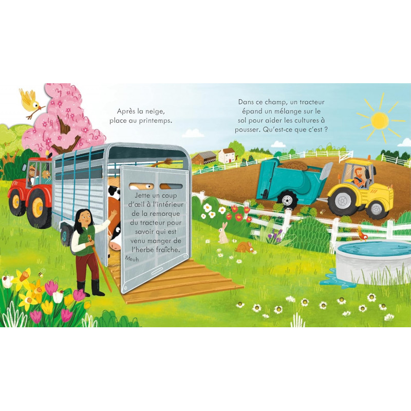 Soulève les rabats et regarde à travers les trous pour suivre ce que fait un tracteur à la ferme pendant l'année.