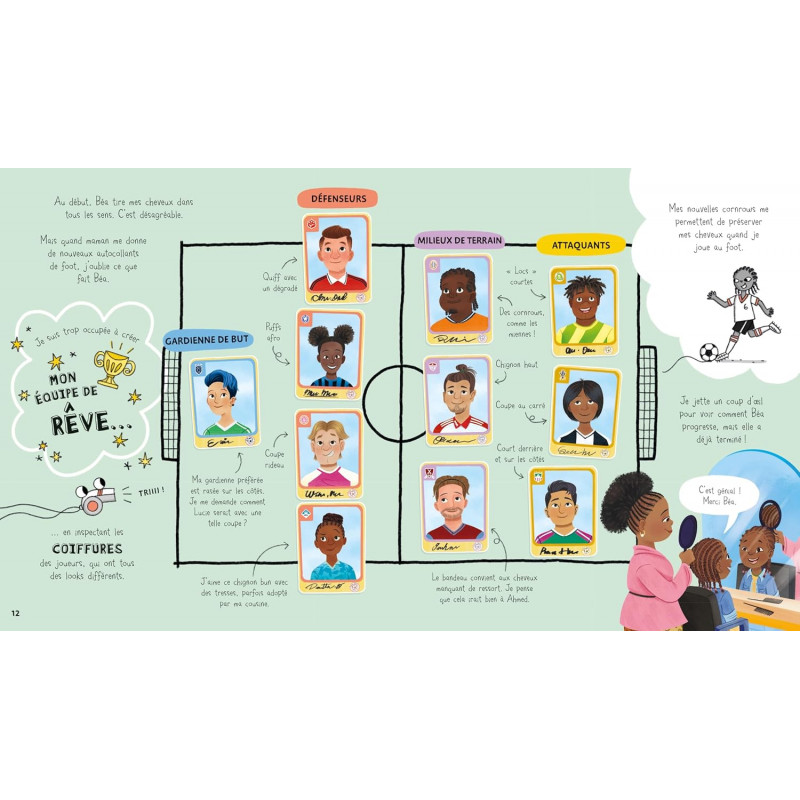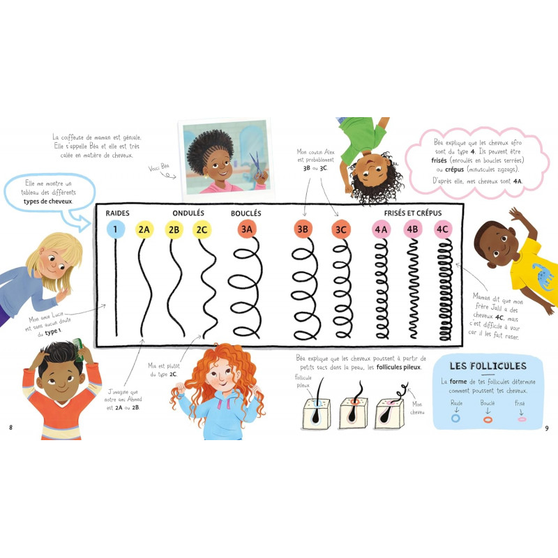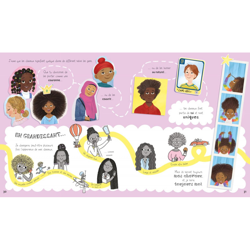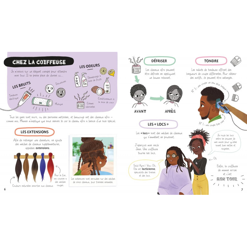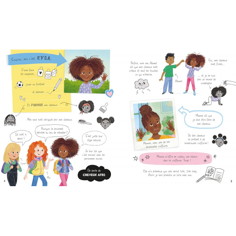 Un livre illustré positif et réconfortant pour apprendre à aimer tes cheveux et la personne unique que tu es. Suis Kyra, qui va te raconter ce qu'elle pense de ses cheveux afro et partager avec toi toutes les informations qu'elle découvre sur les différents types de cheveux. Après un tour chez la coiffeuse, ses camarades de classe ont plein de questions à lui poser et inversement ! Apprends tout sur les cheveux raides et bouclés, roux et bruns, les tresses cornrow et queue de poisson dans ce livre positif et réconfortant qui t'encouragera à devenir fier de qui tu es. Ce livre a été écrit avec la collaboration de The Halo Collective, une organisation britannique de jeunes qui luttent contre la discrimination capillaire et célèbrent les cheveux et les coiffures des Noirs. Avec la contribution de l'association britannique contre le racisme et les discriminations Show Racism the Red Card. Un livre à mettre dans toutes les mains des enfants pour les encourager à devenir fiers de qui ils sont et à respecter les différences de ceux qui les entourent. A partir de 6 ans.