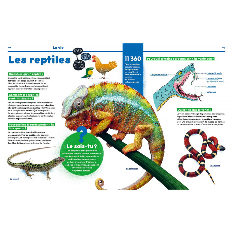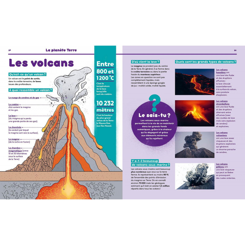 Pour chaque sujet, des questions/réponses ludiques accompagnées d'illustrations et de photos, des pages d'expériences et des quiz !