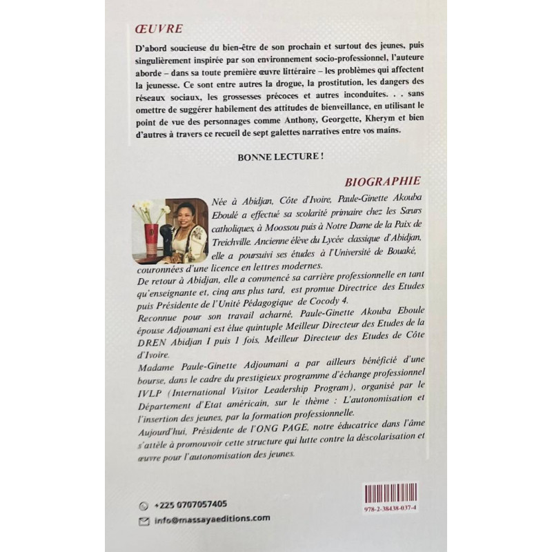 D'abord soucieuse du bien-être de son prochain et surtout des jeunes, puis singulièrement inspirée par son environnement socio-professionnel, l'auteure aborde - dans sa toute première œuvre littéraire – les problèmes qui affectent la jeunesse. Ce sont entre autres la drogue, la prostitution, les dangers des réseaux sociaux, les grossesses précoces et autres inconduites. sans omettre de suggérer habilement des attitudes de bienveillance, en utilisant le point de vue des personnages comme Anthony, Georgette, Kherym et bien d'autres à travers ce recueil de sept galettes narratives entre vos mains.
