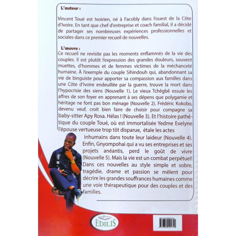 Ce recueil ne revisite pas les moments enflammés de la vie des couples. Il est plutôt l'expression des grandes douleurs, souvent muettes, d'hommes et de femmes victimes de la méchanceté humaine. À l'exemple du couple Sihindouh qui, abandonnant sa vie de binguiste pour apporter sa compassion aux familles dans une Côte d'Ivoire endeuillée par la guerre, trouve la mort dans l'hypocrisie des siens (Nouvelle 1). Le vieux Tchêgbê essuie les affres de son foyer en apprenant à ses dépens que polygamie et héritage ne font pas bon ménage (Nouvelle 2). Frédéric Kokobo, devenu veuf, croit bien faire de choisir pour compagne sa baby-sitter Apy Rosa. Hélas! (Nouvelle 3). Et l'histoire pathétique du couple Toué, où est immortalisée Yedme Evelyne l'épouse vertueuse trop tôt disparue, étale les actes inhumains dans toute leur laideur (Nouvelle 4). Enfin, Gnyompohai qui a vu ses entreprises et ses projets anéantis, perd le goût de vivre (Nouvelle 5). Mais la vie est un combat perpétuel! Dans ces nouvelles au style simple et sobre, tragédie, drame et passion se mêlent pour décrire les grandes souffrances humaines comme une voie thérapeutique pour des couples et des familles.adultes bienveillants, Kitan et Tchewa apprendront que, même après les plus grandes épreuves, il existe toujours un chemin vers la guérison. "Les défis de Kitan (Enfances fragiles)" est un récit poignant sur l'amitié, la résilience et la quête de soi. Il montre qu'aucune souffrance n'est insurmontable lorsqu'on trouve du réconfort dans l'autre... et en soi-même.