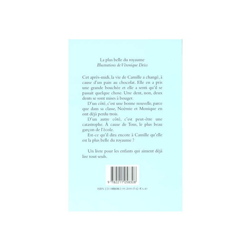 Cet après-midi, la vie de Camille a changé, à cause d'un pain au chocolat. Elle en a pris une grande bouchée et elle a senti qu'il se passait quelque chose. Une dent, non, deux dents se sont mises à bouger. D'un côté, c'est une bonne nouvelle, parce que dans sa classe, Noémie et Monique en ont déjà perdu trois. D'un autre côté, c'est peut-être une catastrophe. A cause de Tom, le plus beau garçon de l'école. Est-ce qu'il dira encore à Camille qu'elle est la plus belle du royaume ? Un livre pour les enfants qui aiment déjà lire tout seuls.