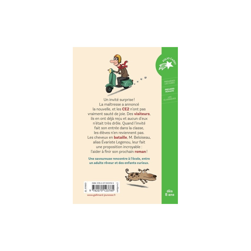 Un invité surprise ! La maîtresse a annoncé la nouvelle, et les CE2 n'ont pas vraiment sauté de joie. Des visiteurs, ils en ont déjà reçu et aucun d'eux n'était très drôle. Quand l'invité fait son entrée dans la classe, les élèves n'en reviennent pas. Les cheveux en bataille, M. Beloiseau, alias Evariste Legenou, leur fait une proposition incroyable : l'aider à finir son prochain roman ! Une savoureuse rencontre à l'école, entre un adulte rêveur et des enfants curieux.