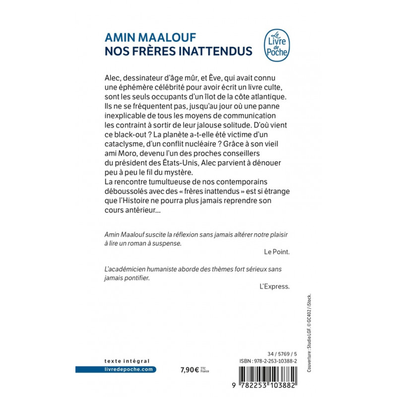 La rencontre tumultueuse de nos contemporains déboussolés avec des "frères inattendus" est si étrange que l'Histoire ne pourra plus jamais reprendre son cours antérieur... Amin Maalouf suscite la réflexion sans jamais altérer notre plaisir à lire un roman à suspense. Le Point. L'académicien humaniste aborde des thèmes fort sérieux sans jamais pontifier. L'Express.