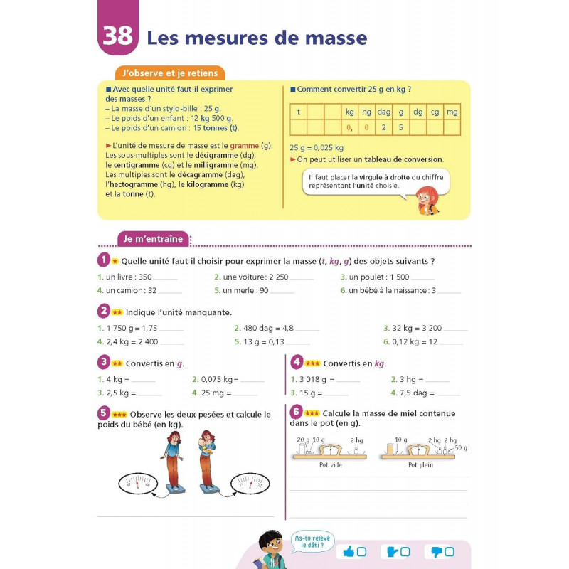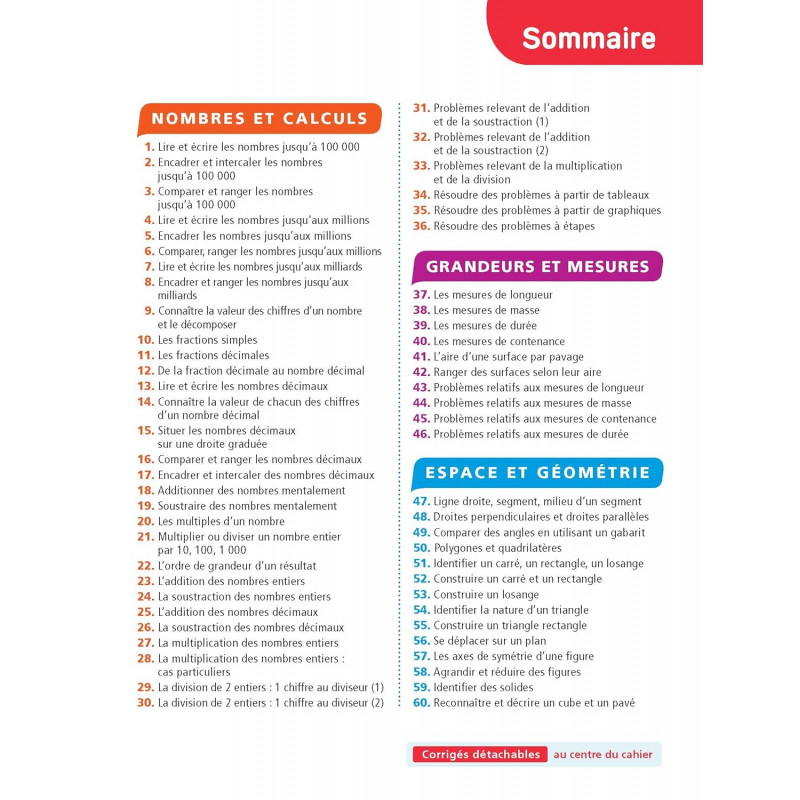 Un cahier complet pour des révisions efficaces - Réviser s'entraîner grâce à une structure simple et efficace : - tout le programme : nombres et calculs, grandeurs et mesures, espace et géométrie - des leçons claires et synthétiques - des exemples éclairants - de nombreux exercices et un cahier central détachable avec les corrigés - Mémoriser l'essentiel grâce à des mémos visuels Des schémas et cartes mentales pour retenir facilement : la technique de l'addition (nombres entiers et décimaux), la technique de la soustraction (nombres entiers et décimaux), la technique de la multiplication, la technique de la division, les triangles, les quadrilatères, les polyèdres...