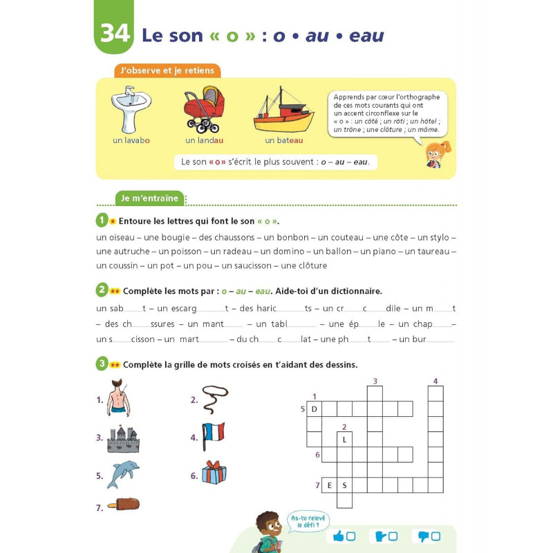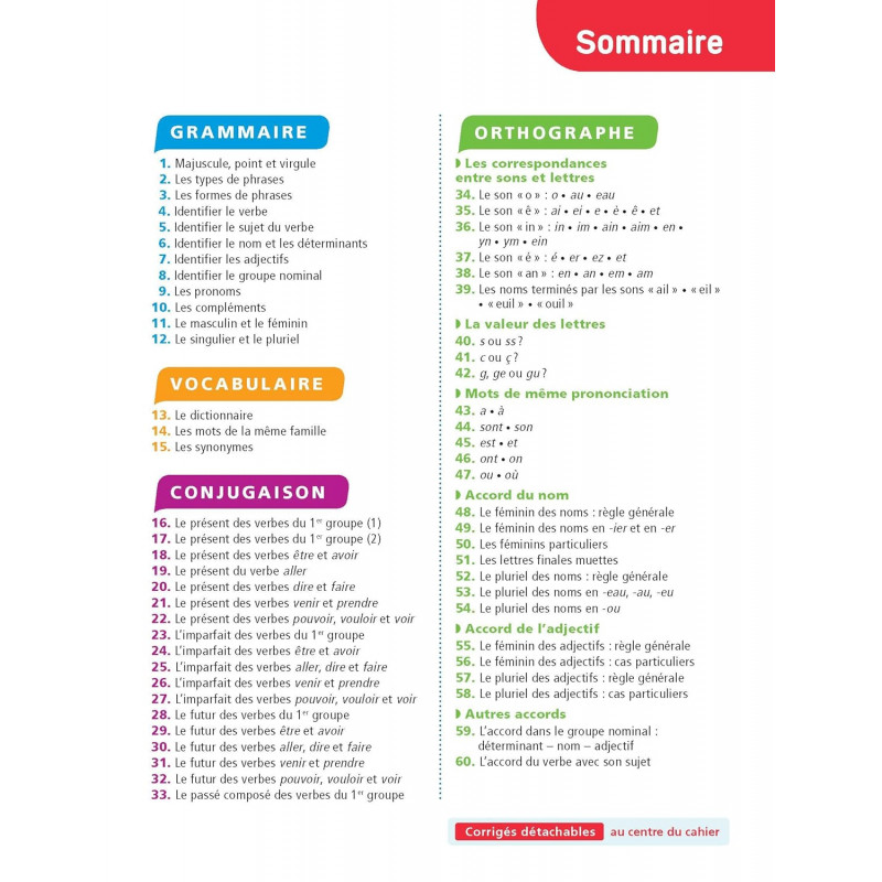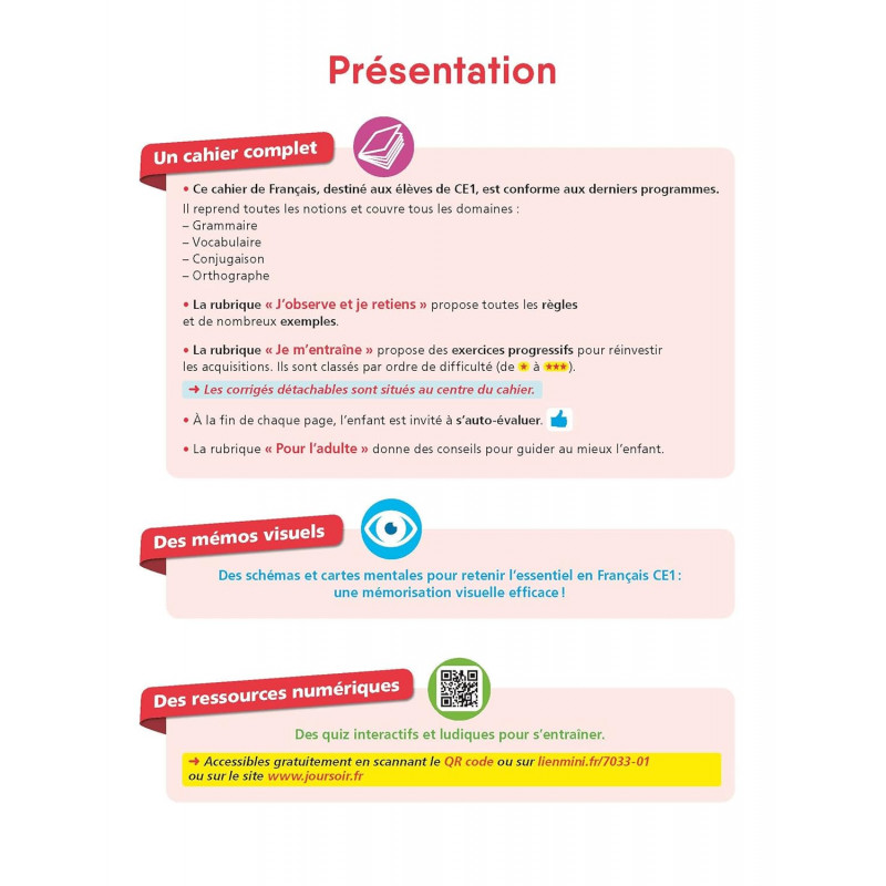 Pour réviser et progresser en français Tout le programme de CE1 pour s'entraîner - Toutes les leçons en grammaire, orthographe, conjugaison et vocabulaire - Toutes les règles et des exemples pour mieux comprendre - Des exercices progressifs pour mettre en pratique - Tous les corrigés dans un cahier central détachable + Des mémos visuels pour retenir facilement l'essentiel : les sons et les lettres, la phrase, le masculin et le féminin, le singulier et le pluriel, le sujet et le verbe, les tableaux de conjugaison (présent, imparfait, futur, passé composé)...